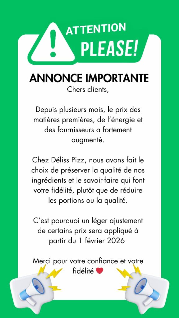 Chez Deliss’ Pizz, on vous sert des pizzas artisanales croustillantes et des smash burgers maison ultra savoureux, le tout préparé avec des ingrédients frais et de qualité !